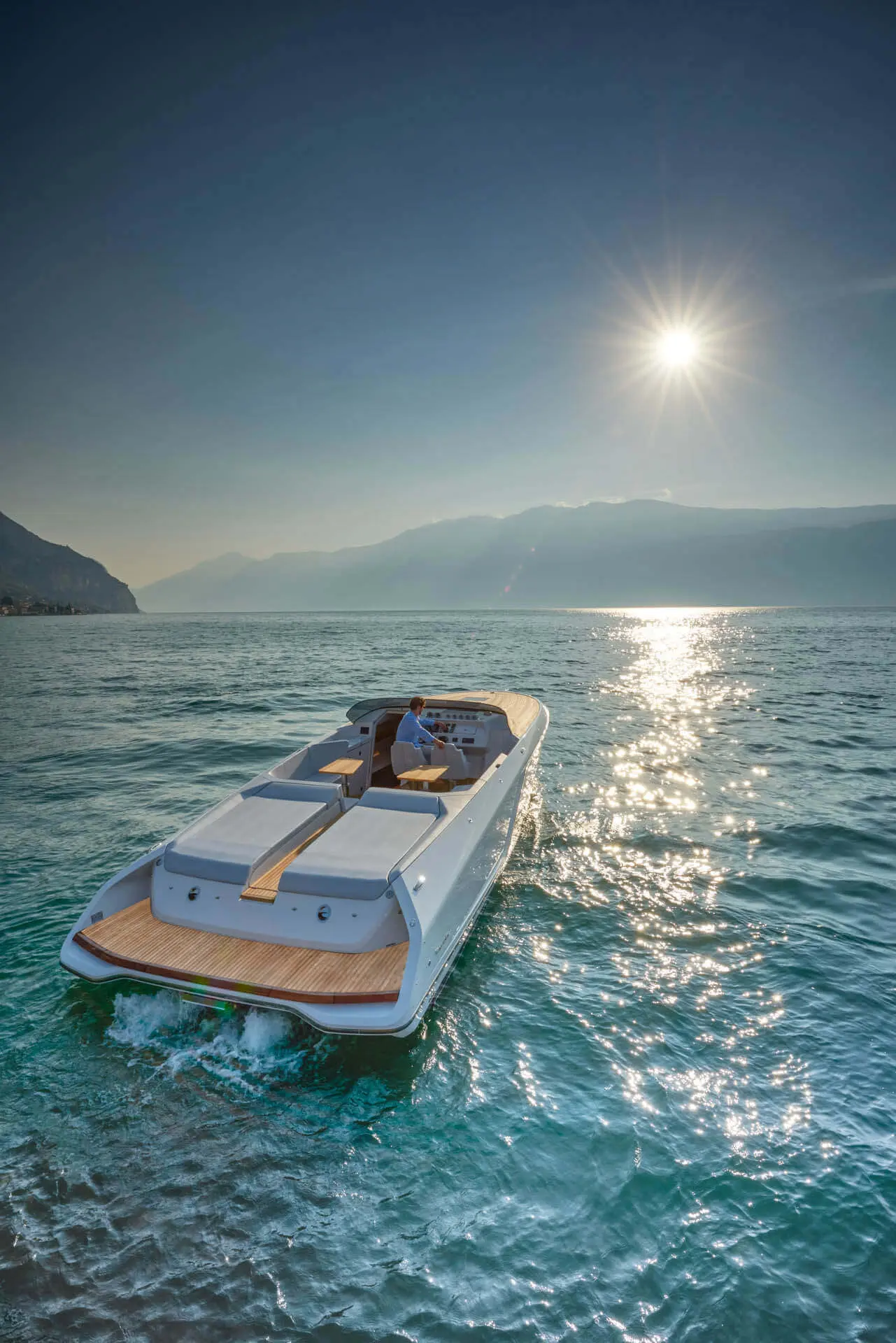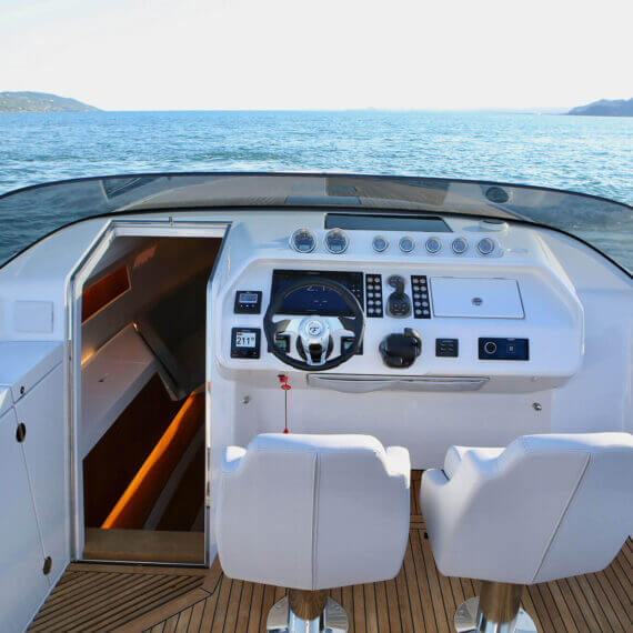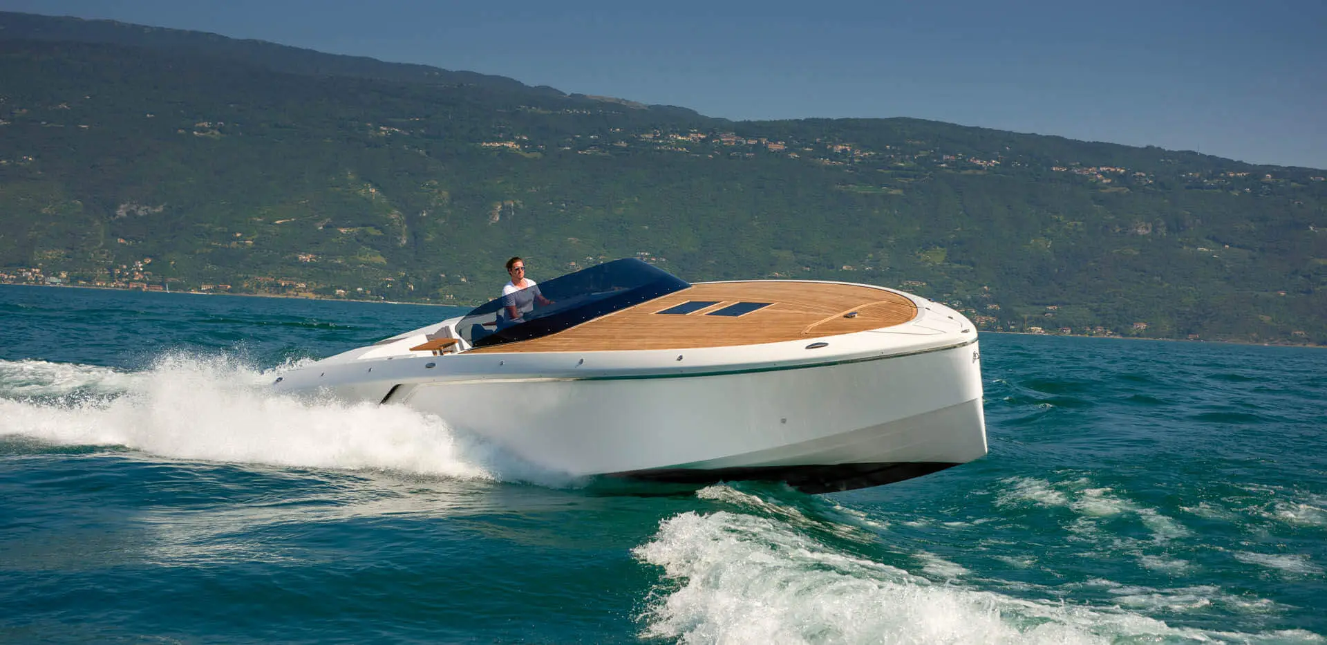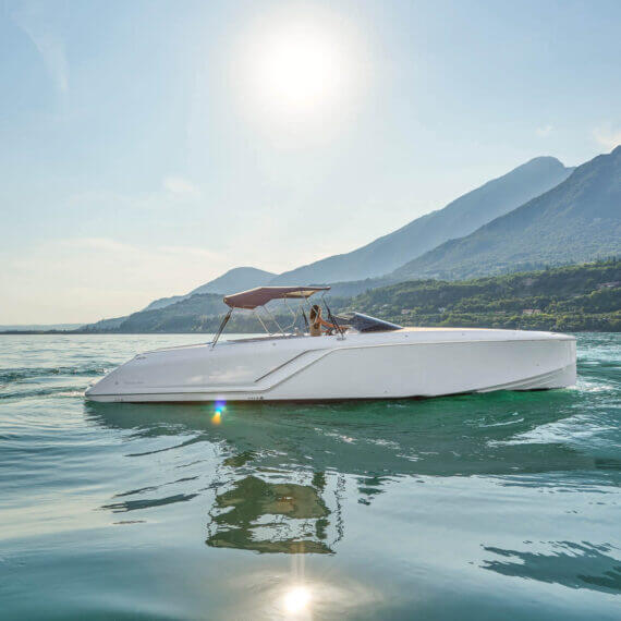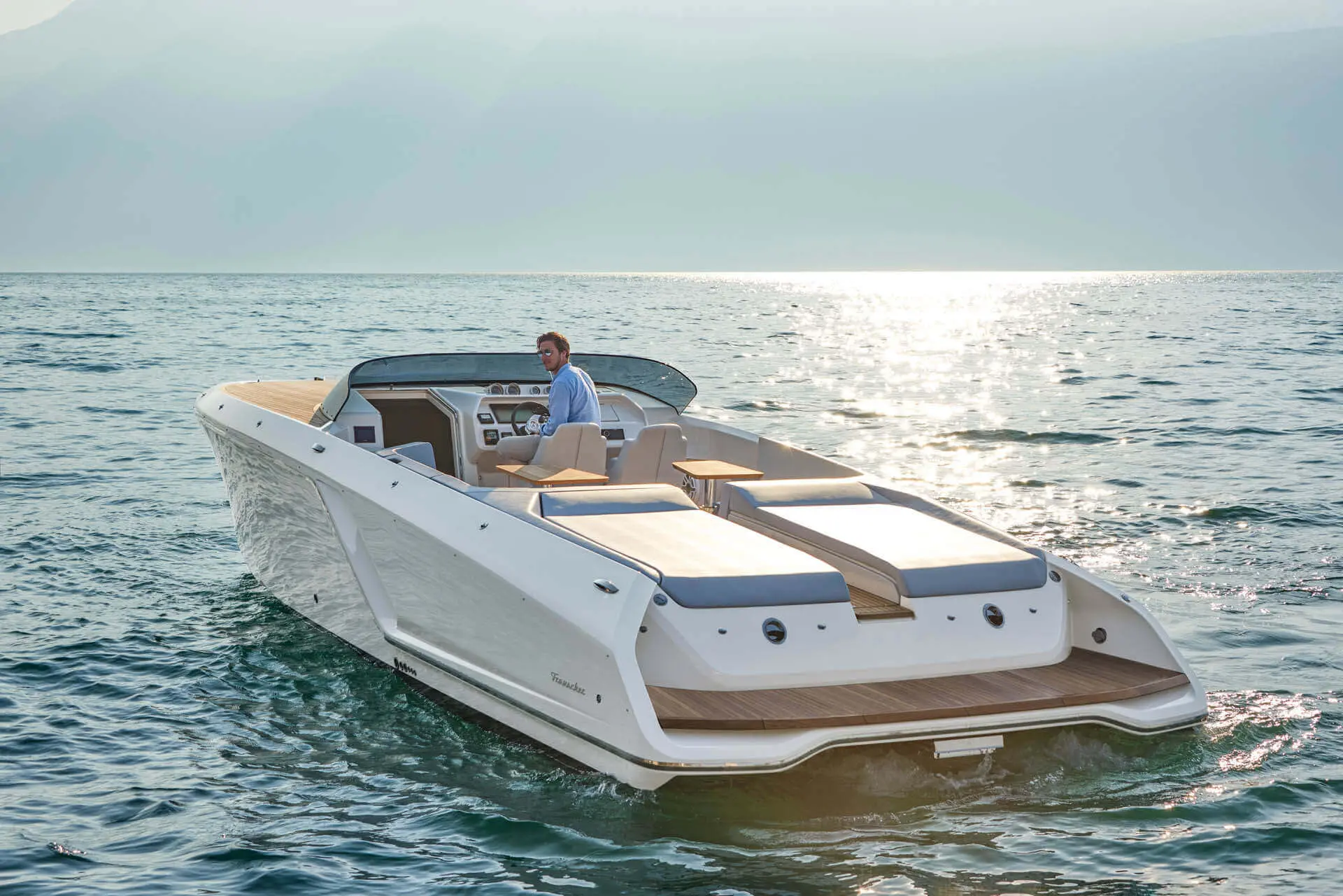 While most Ghosts stay invisible the new Frauscher 1212 Ghost enthuses with an evolution of the Frauscher design language that is both bold and beautiful. Along with other Frauscher models the 1212 Ghost features distinctive elements like the huge teak deck, frameless and tinted windscreen as well a straight bow design – for a maximum of space and comfort. The side air intakes – first featured on the 747 Mirage and then on the 1414 Demon – are further developed and give the side profile a very distinctive look. The back features a swooping design framing the generous teak bathing platform in spectacular fashion.