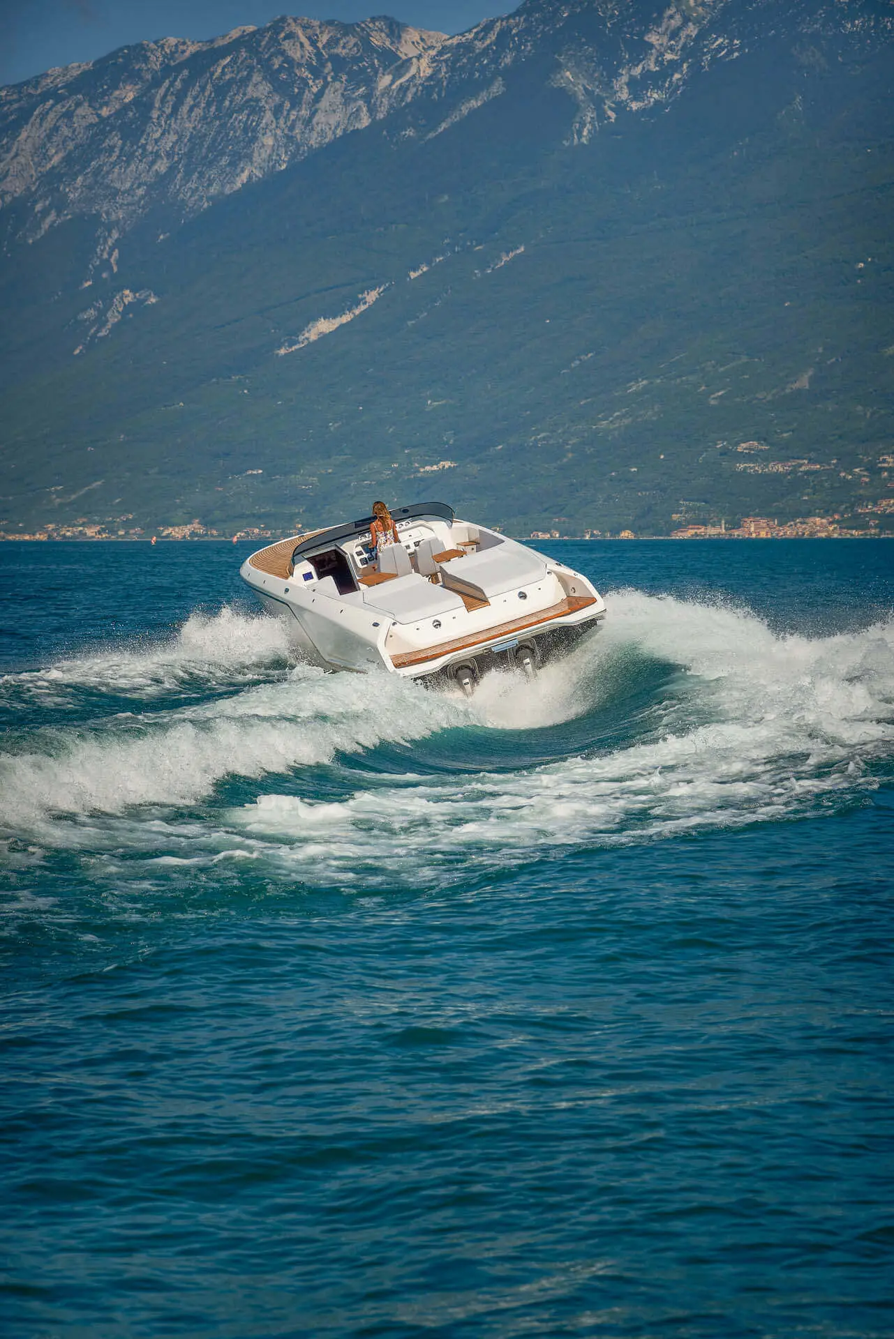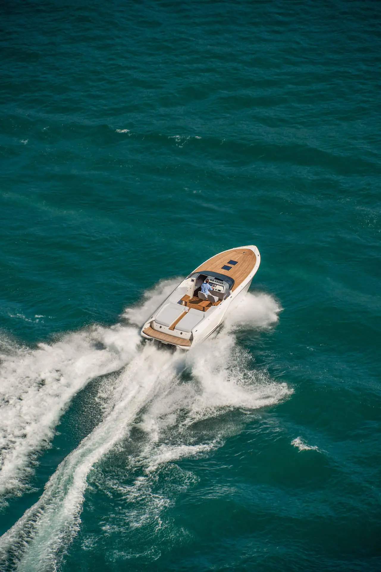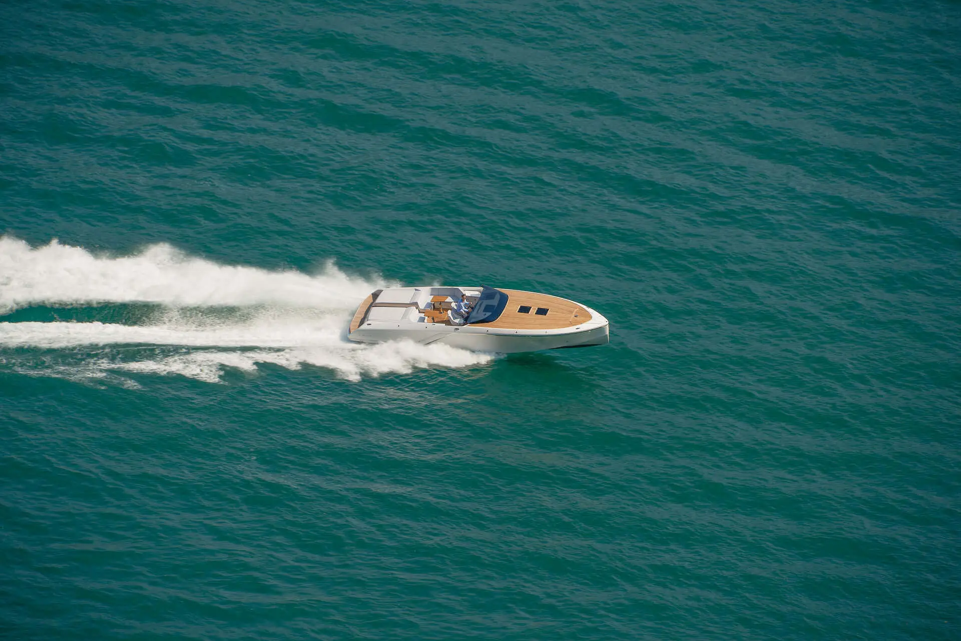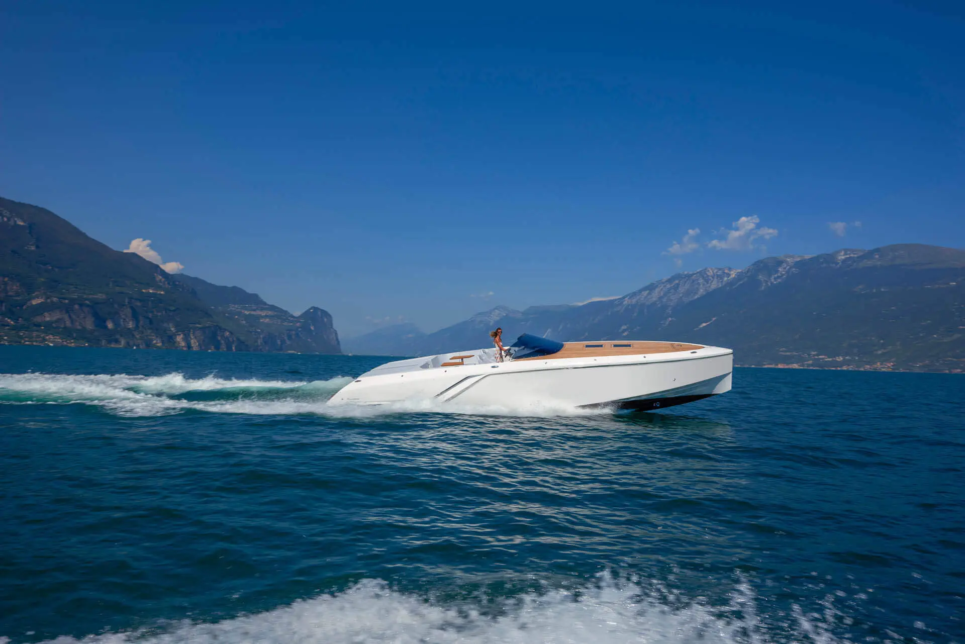 While most Ghosts stay invisible the new Frauscher 1212 Ghost enthuses with an evolution of the Frauscher design language that is both bold and beautiful. Along with other Frauscher models the 1212 Ghost features distinctive elements like the huge teak deck, frameless and tinted windscreen as well a straight bow design – for a maximum of space and comfort. The side air intakes – first featured on the 747 Mirage and then on the 1414 Demon – are further developed and give the side profile a very distinctive look. The back features a swooping design framing the generous teak bathing platform in spectacular fashion.