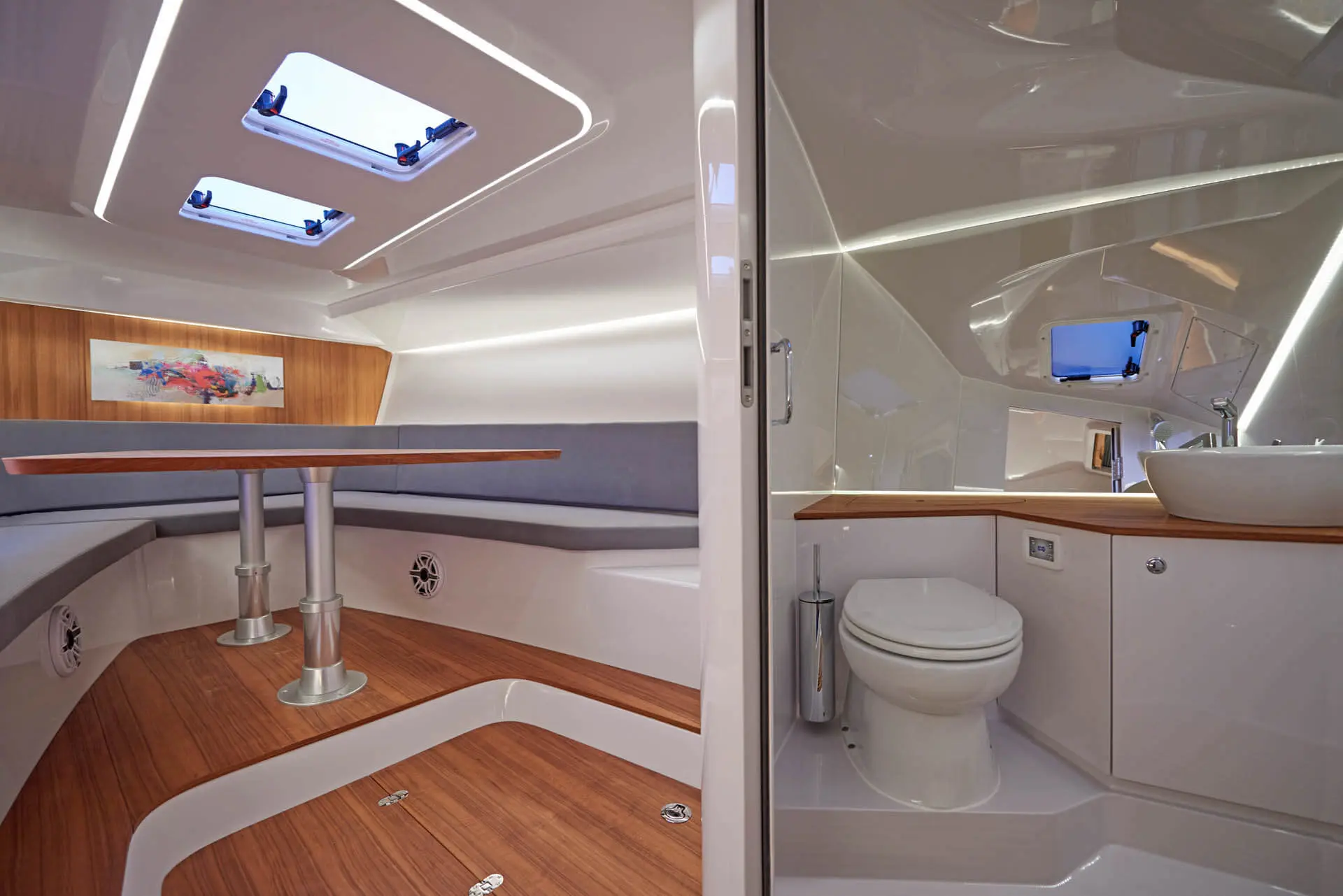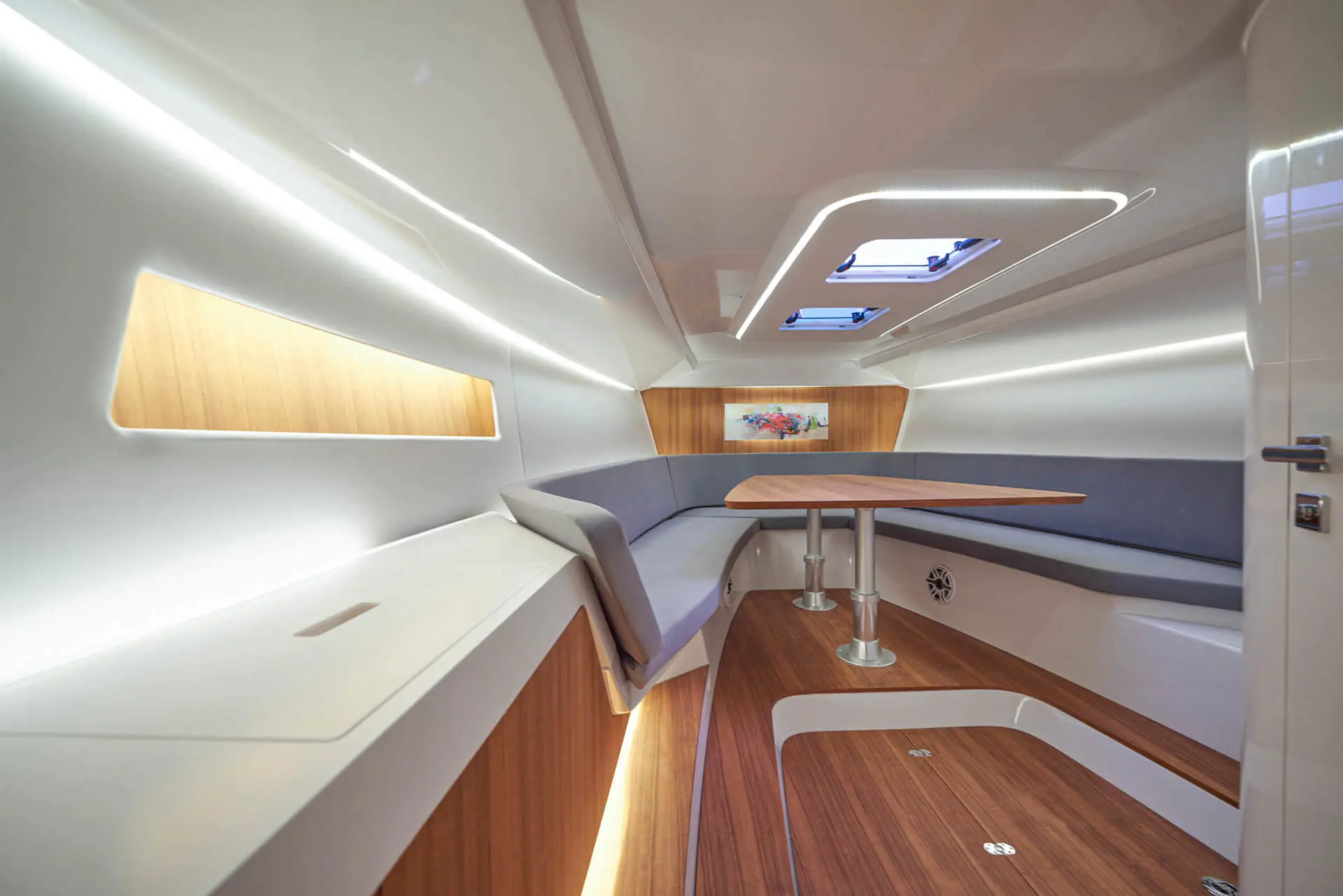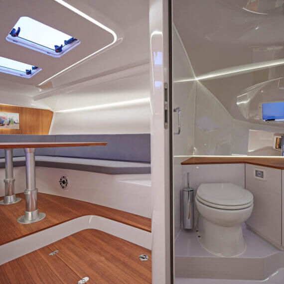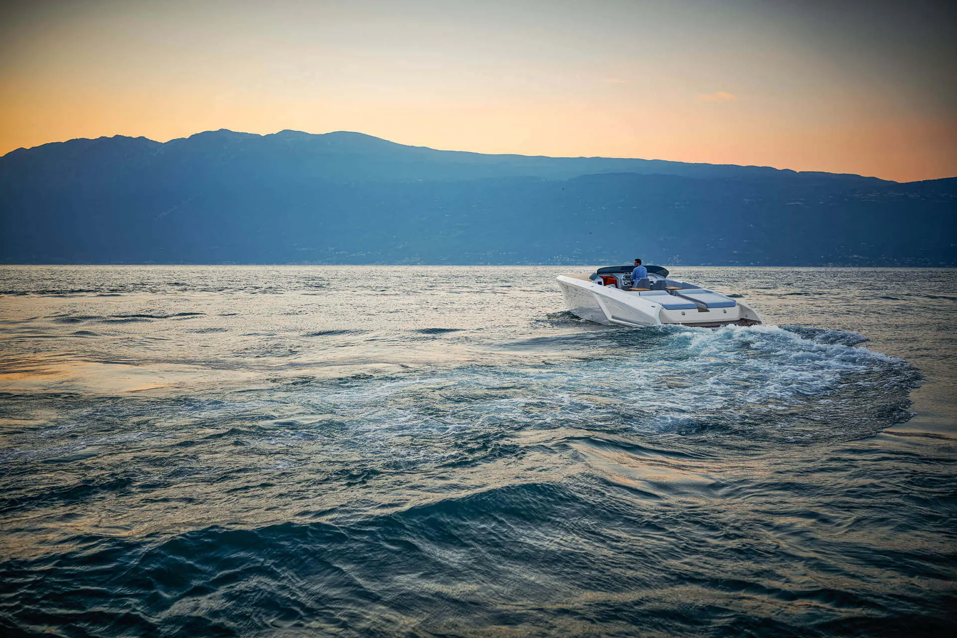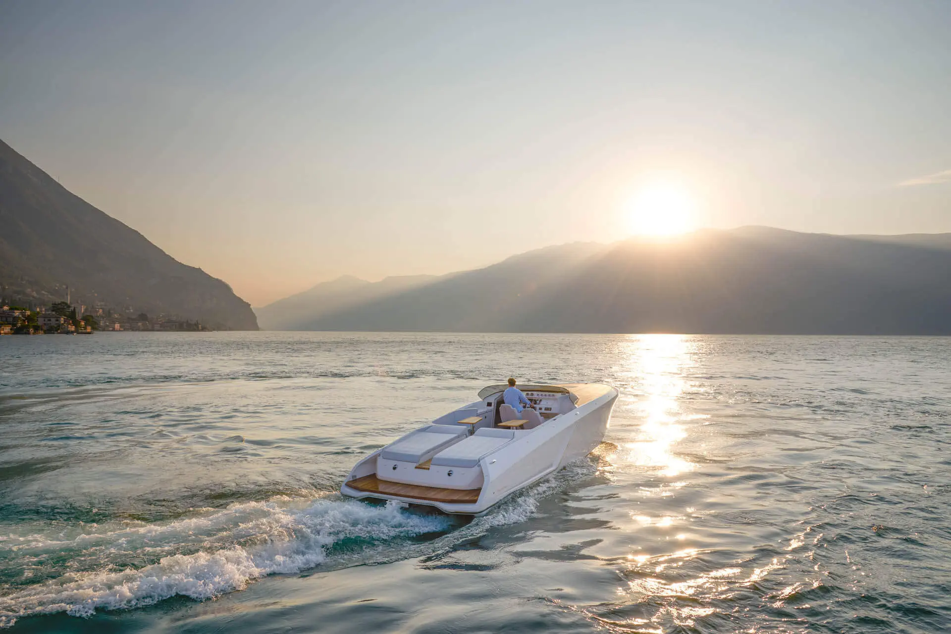 While most Ghosts stay invisible the new Frauscher 1212 Ghost enthuses with an evolution of the Frauscher design language that is both bold and beautiful. Along with other Frauscher models the 1212 Ghost features distinctive elements like the huge teak deck, frameless and tinted windscreen as well a straight bow design – for a maximum of space and comfort. The side air intakes – first featured on the 747 Mirage and then on the 1414 Demon – are further developed and give the side profile a very distinctive look. The back features a swooping design framing the generous teak bathing platform in spectacular fashion.